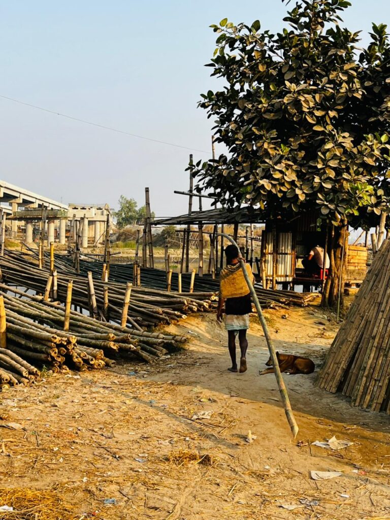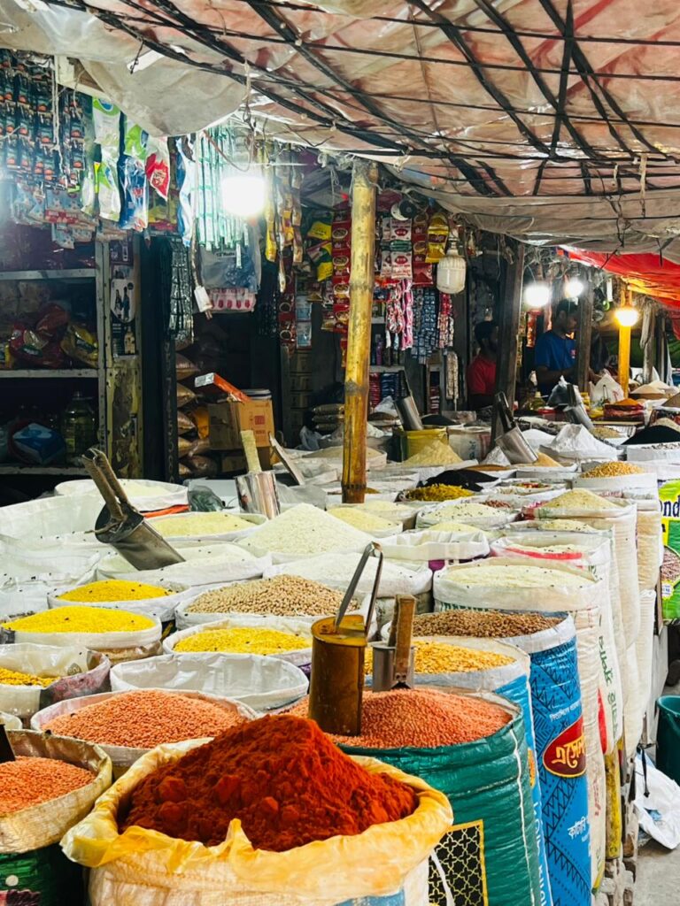 নদীপাড়ে নোঙর করা নৌকা।বাঁশের স্তুপে শ্রমজীবী জীবন।ঐতিহ্যবাহী মাটির ও বেতের সামগ্রী।বাজারে ডাল ও মসলার পসরা।